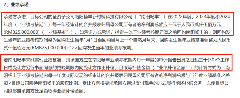 值得注意的是,本次股份转让协议特地对路畅科技全资子公司南阳畅丰新材料科技有限公司提出业绩要求——在2022年度、2023年度和2024年度,每一年经审计的合并报表归属母公司所有者的净利润总额应不低于2500万元。