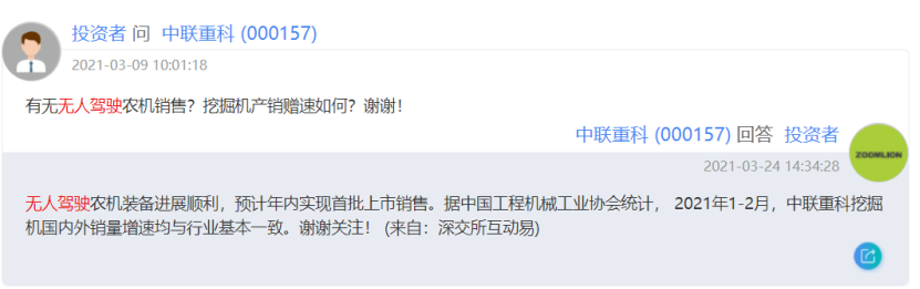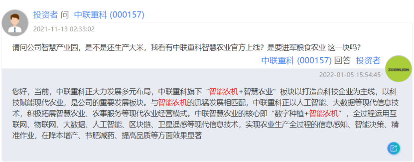 中联重科在互动易上曾回复称,公司正大力发展多元布局,中联重科旗下“智能农机+智慧农业”板块以打造高科技企业为主线,以科技赋能现代农业,是公司的重要发展板块。