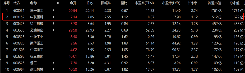 从中联重科所属的工程机械行业板块来看,虽然总市值排名第二,但不足龙头三一重工的三分之一。
