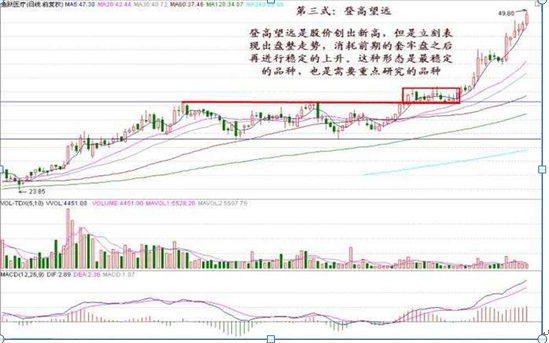 登高望远是指股价创出新高,但是理科表现出盘整走势,消耗前期的套牢盘之后再进行稳定的上升,这种形态是最稳定的品种,也是需要重点研究的品种。