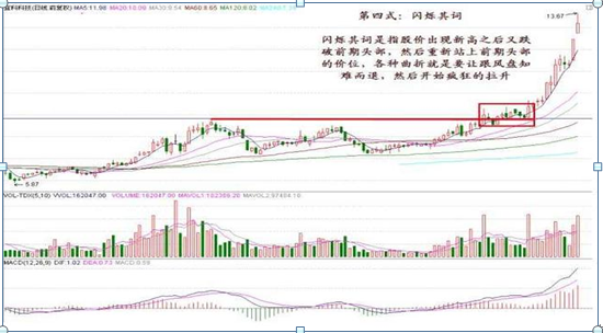 闪烁其词是指股价出现新高之后又下破前期头部,然后重新站上前期头部的价位,各种曲折就是要让跟风盘知难而退,然后开始疯狂的拉升。