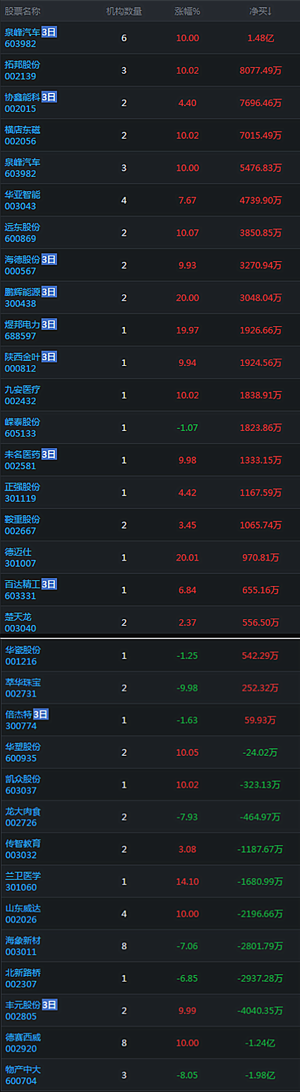 第一名:泉峰汽车,汽车产业链概念,龙虎榜三日机构席位净买入2.18亿。