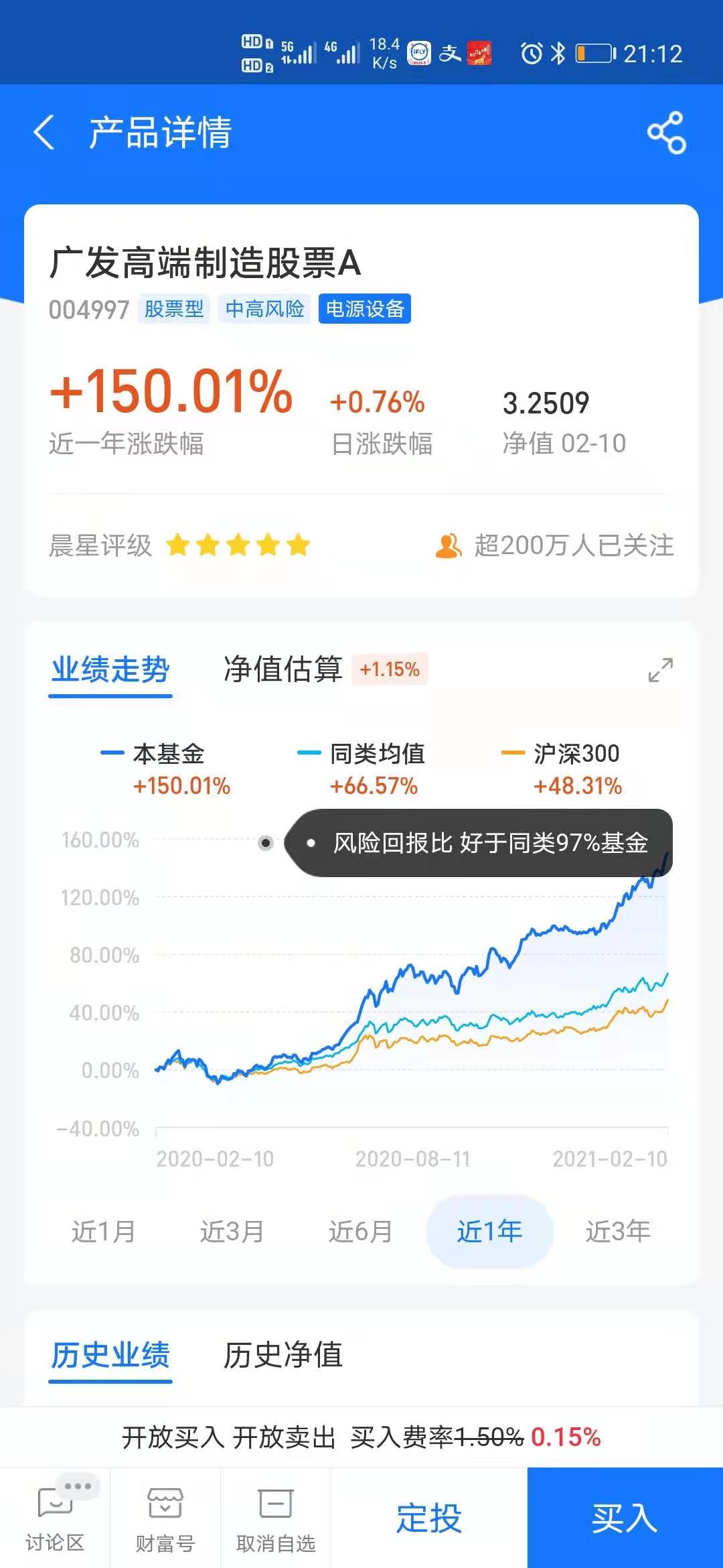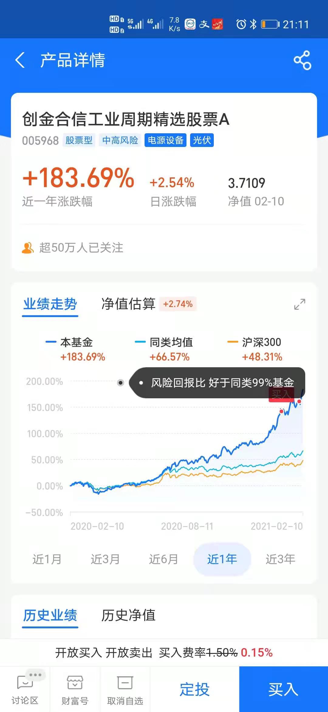 近一年回报150%,近两年回报331.15%,数据非常漂亮。当然这只基金可能会有一定的不稳定性,主要要关注化工行业的稳定性。这一只化工类基金,也可以考虑用今年很优秀的大摩进取优选来代替,基金规模2亿,略少,但还可以。