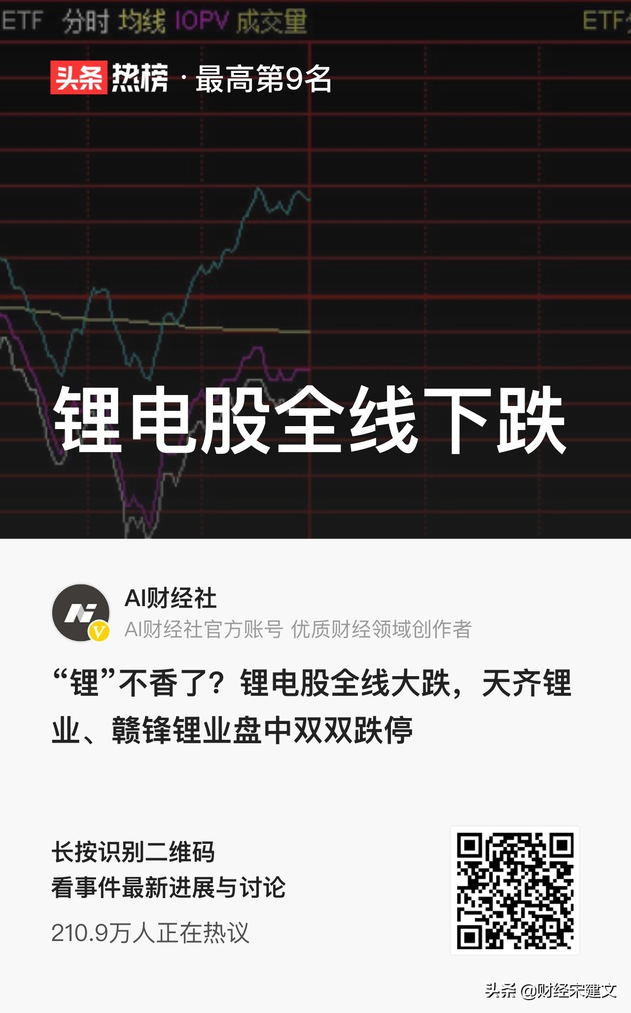 1.今天锂电板块跌得很厉害,被股民们称为“中国锂王”的天齐锂业跌停了,赣锋锂业也跌停了,还有小金属钴、稀土也出现大跌,华友钴业跌停,五矿稀土跌停。其实这些股票跌停并不意外,因为在此之前它们都出现大涨,甚至出现多日涨停的走势,股票涨多了自然会跌,获利盘集中出局,带来短期大跌。包括光伏板块和军工板块,其实都是这个逻辑。