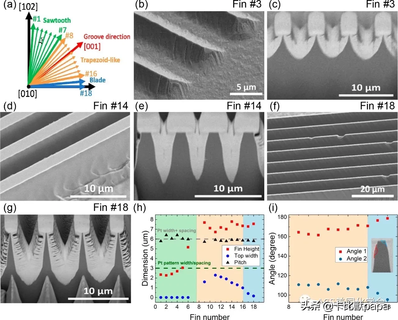 图1. 金属辅助化学蚀刻(MacEtch)所产生的各式β型氧化镓纳米结构与其相对应的晶体取向分布。