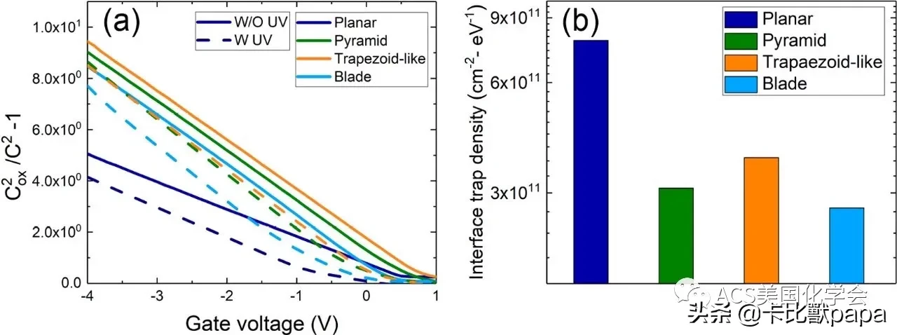 图4. 各式β型氧化镓结构与氧化铝的界面电容-电压测量结果与其界面缺陷密度。