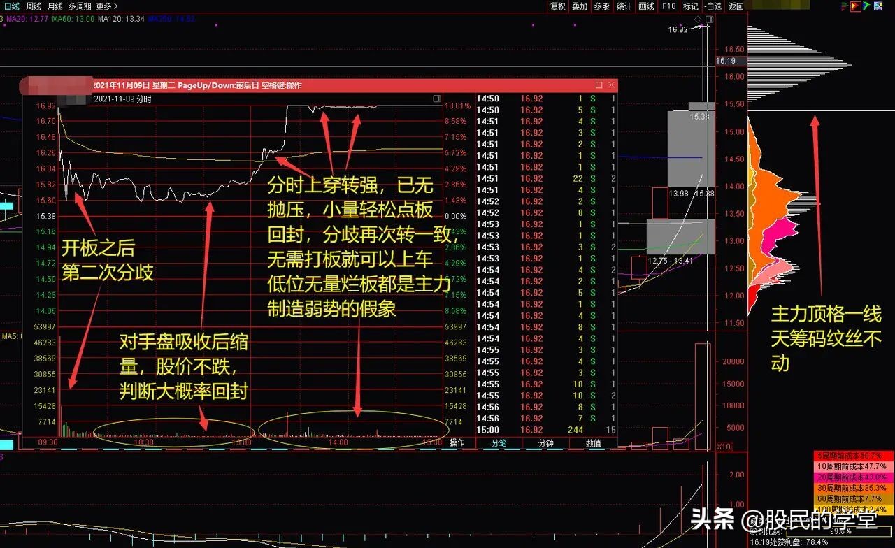 2、看日内分时走势,强势股的分时图是多空双方激烈博弈的直观体现,强势分时走势为股价持续在黄色均价线上方运行;反之则是弱势的表现,分时多次上下穿过黄色均线线,则表明分歧较大;股价下穿均价线回不来表示分时走弱,而股价上穿分时均线并站稳甚至封板则表示弱转强;