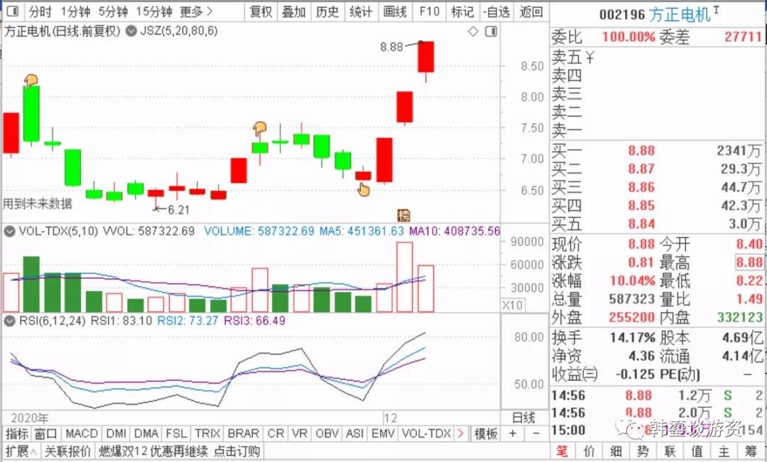 方正电机(002196)不知不觉走出3连板,昨日封个烂板,今日还能逆势快速涨停,看来不可小觑;昨日主导做多的两家游资几乎锁仓没动,今日又是受到活跃游资华鑫深圳益田路、知名游资欢乐海岸的接力继续做多,资金呈现小幅净流入;该股的炒作逻辑如下:1. 公司目前驱动电机产能为10万台,产品主要面向A00级、A0级的新能源乘用车及电动物流车;2. 公司与北京四维图新科技股份有限公司签署战略合作协议;3.公司给五菱宏光mini ev每月提供驱动电机1-2万台。后市可择机继续关注。