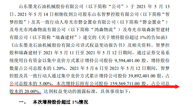 此次增持也引起了深交所的注意,深交所5月18日晚间向智梦控股发函,深交所称,智梦控股疑似拟通过不断增持来获得山东墨龙控制权。