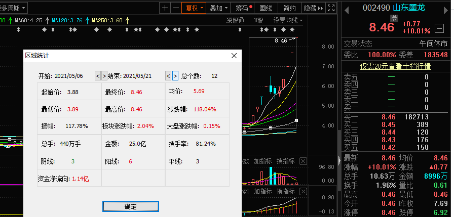 山东墨龙3日前率先封板,随后3日均以一字板开盘,至今已连续4连板,而从5月6日开始计算,仅半月光景,该股已涨逾118%。