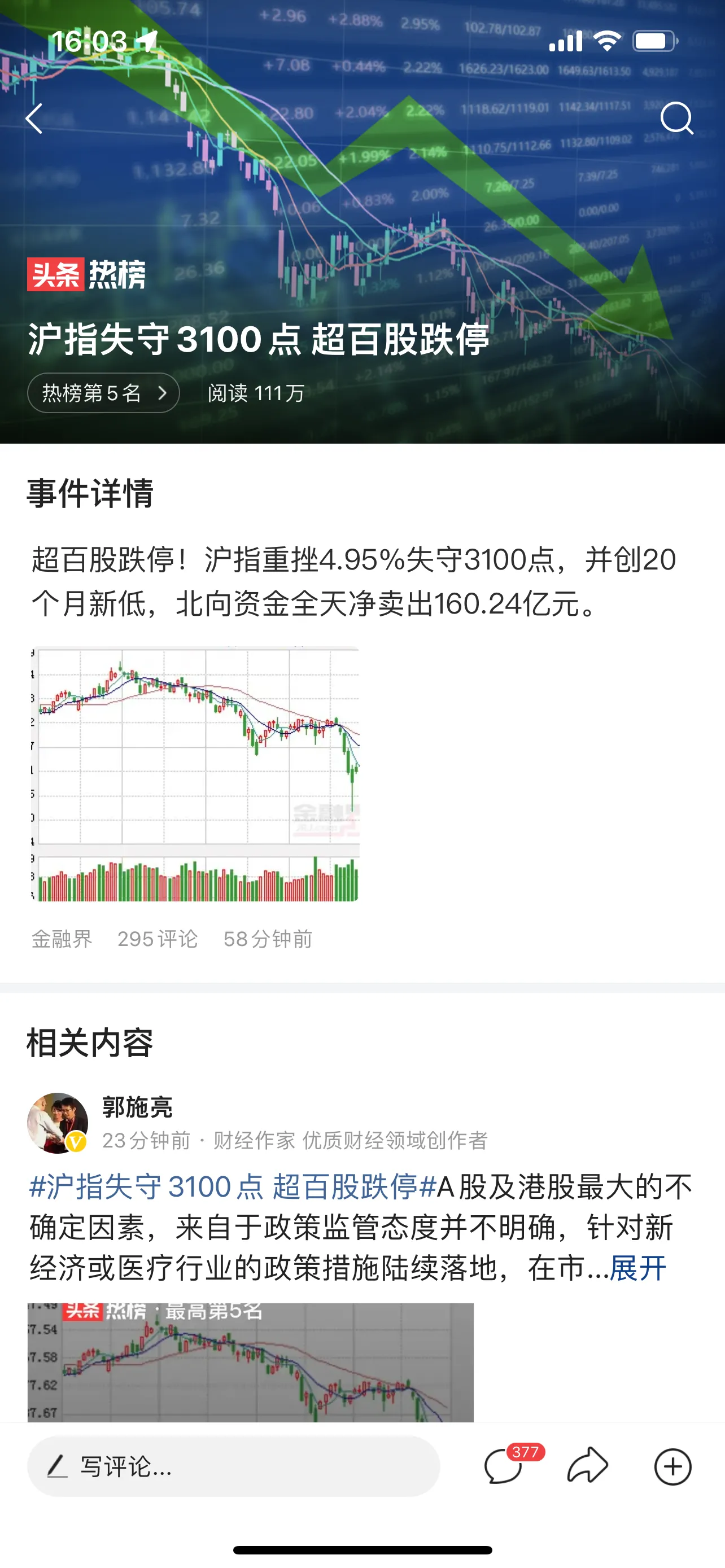 #沪指失守3100点 超百股跌停#A股、港股同时遭遇“黑色星期二”。最大的意外是沪指竟然出现4.95%接近5%的跌幅,沪综指权重股重挫,万万没有想到。本来以为周二(3月15日)科技股应该会继续较大幅度走低。因为凌晨收盘的美股周一收跌,标普500指数跌0.74%。衡量中概股整体表现的纳斯达克中国金龙指数连续第三个交易日暴跌逾10%,收盘跌幅达到11.7%,一举打破了2008年金融危机时期创下的跌幅纪录。相较2021年2月创下的历史高点,纳斯达克中国金龙指数累计跌幅已经超过75%。最近三个交易日,中概股总市值累计损失了约2771亿美元(约合1.76万亿元人民币)。