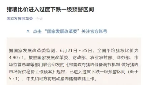 有媒体报道,国家发展改革委监测,6月21日~25日,全国平均猪粮比价为4.901。按照之前多部门联合印发的《完善政府猪肉储备调节机制 做好猪肉市场保供稳价工作预案》规定,已进入过度下跌一级预警区间(低于51),中央和地方将启动猪肉储备收储工作!
