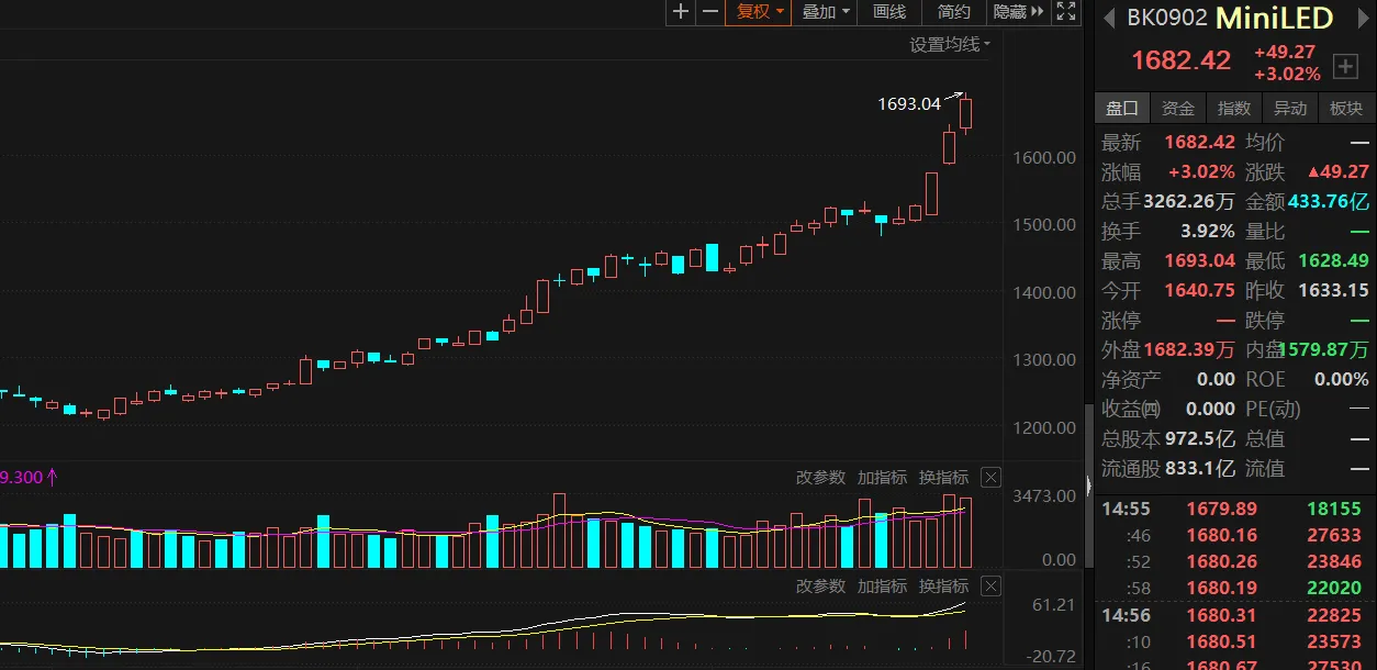 mini LED概念:今天继续表现强势,龙头中军继续上板,其他的也跟着涨了10厘米。mini LED概念是低位新起来的科技方向,赌的就是月底华为的新品发布会。这一波短线收获应该都还不错。因为是从低位起来的,之前并没有在高位。目前来看,资金追捧力度最大的设备、芯片、背光模组这几个细分方向。不过接下来要注意一下高位震荡的风险了,毕竟已经连续大涨3天了。
