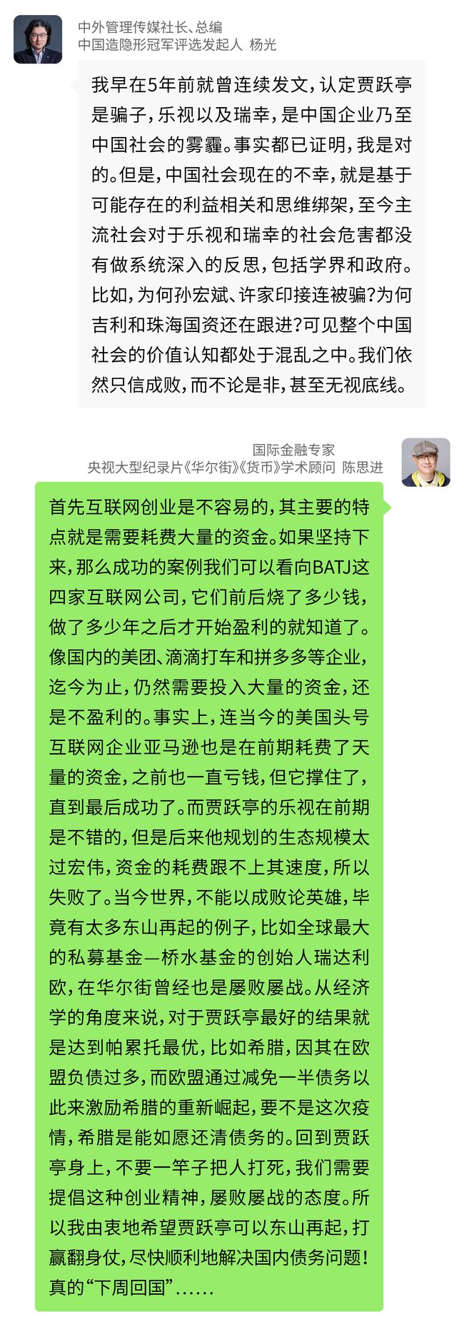 回到贾跃亭身上,不要一竿子把人打死,我们需要提倡这种创业精神,屡败屡战的态度。所以我由衷地希望贾跃亭可以东山再起,打赢翻身仗,尽快顺利地解决国内债务问题!真的“下周回国”……