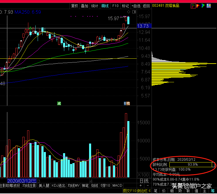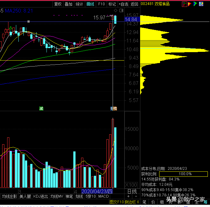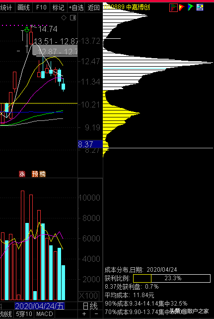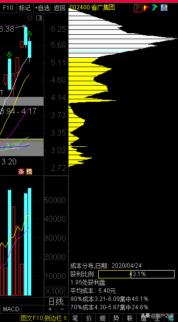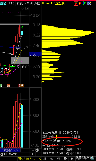 4月14日以一根大阳线方式涨停,获利比例99.7%,6.87处获利盘96.5%。主力的成本在5.8元-6.8元之间。