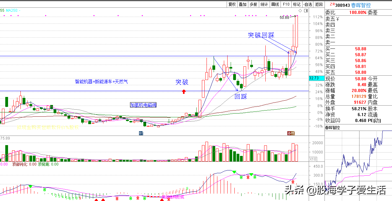 春晖智控(300943)氢能源龙头之一(加氢机电磁阀),3个交易日2天20%涨停,3日涨幅48%,11月19日微头条发文是“三招抓20%涨停”,至今翻倍。技术面突破回踩完美。