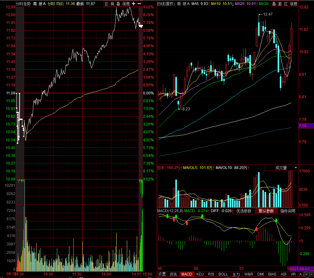 南玻A:近期光伏相关题材大涨,这家伙的主营业务就是光伏科技绿色能源产品,比如高纯硅材料、太阳能超白玻璃、晶体硅太阳能电池、薄膜太阳能电池等及其相关组件等。因为题材正宗,总体位置又不算高,所以这两天迎来了资金大举入场,主要是机构,累计买入两个多亿,从这一波拉起的力度加上机构大举入场的资金流向来看,有点要创新高的意思,可以重点关注一下。