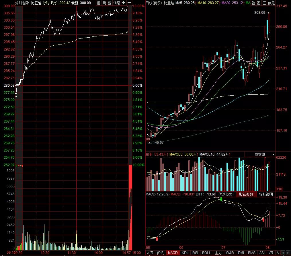 比亚迪:这个票前两天说了大概率要冲击万亿市值,昨天高开低走后在后台迎来了不少质疑,今天果然不负众望直接反包涨停,股价突破300元大关,龙虎榜显示方新侠大举买入三个多亿,还有一路机构助攻两个多亿,十分强势。逻辑已经说得不能再清楚了,既是全球新能源车龙头企业之一,又是国内自主可控的IGBT领导厂商,这两个龙头地位足以。