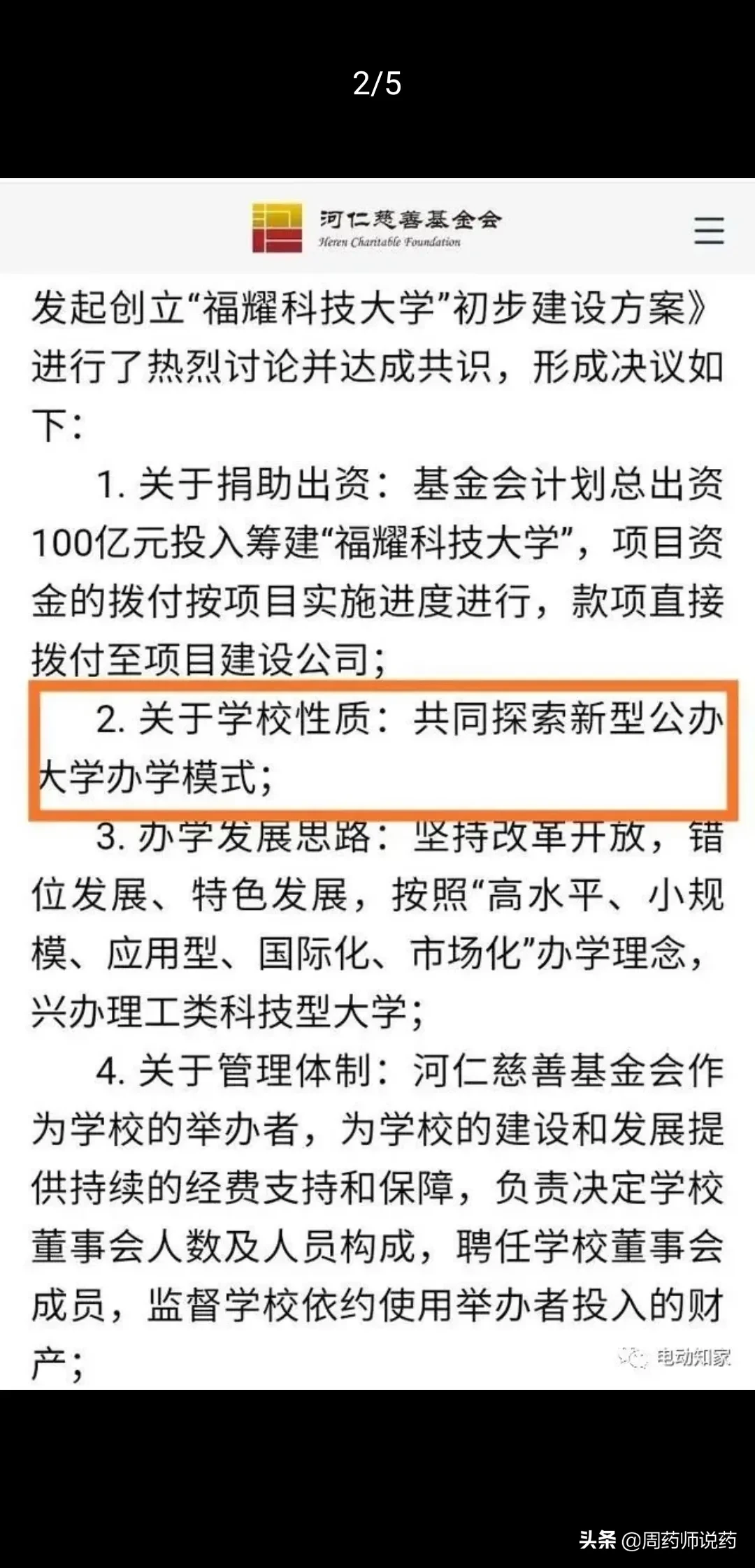 2021年5月2日,河仁基金会宣布投资100亿筹建“福耀科技大学”(暂定名)。这所高校建成之后,将成为全国第四所全福建第一所新型研究型大学,定位是理工类研究型公立大学,培养国内新兴产业急需的研究型,复合型实用型人才。