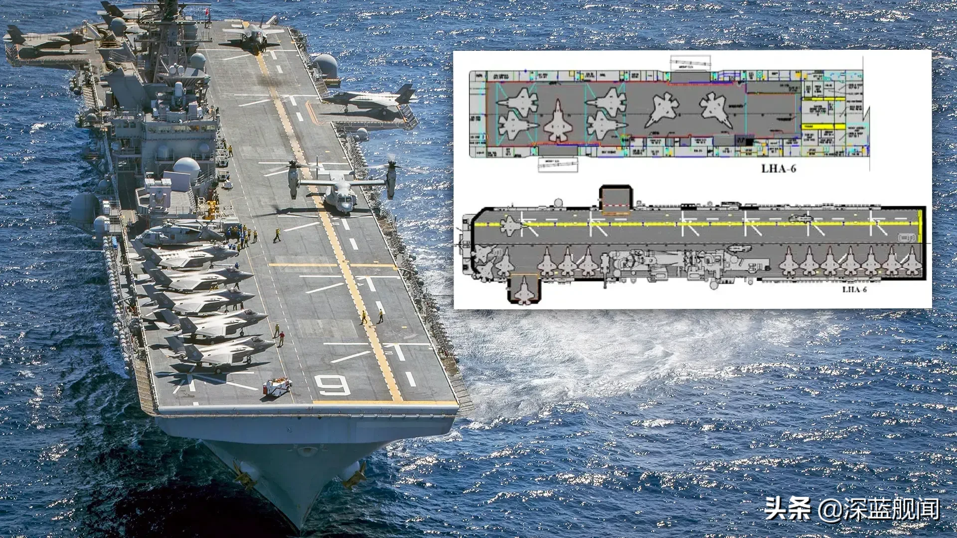 美国海军正在对“闪电航母”这一概念进行测试,本月初来自3个海军陆战队中队共20架F-35B战机被部署在“的黎波里号”两栖攻击舰(LHA-7),闪电航母这一概念是指让两栖攻击舰搭载尽可能多的F-35B战机,来执行制空、制海任务,充当“临时航母”的角色。虽然F-35B在两栖攻击舰上部署已经不是什么新鲜事,但实际部署20架固定翼飞机仍然有不少挑战。首先是两栖攻击舰对比航母甲板作业面积实在太小,另外F-35B无法折叠机翼,极限情况下“美国级”最多在甲板上摆放15架F-35B(图4),但这也仅仅存在理论中,实际操作对于甲板作业效率存在很大影响。其次是随着固定翼舰载机的增加,对于专用机库、燃料、弹药库、维修车间等后勤设施也提出了新需求。美国级前两艘是取消了坞舱,增加了航空器的作业空间,但较老的黄蜂级改装难度较大,并且美国级后续舰艇还是恢复了坞舱设计。