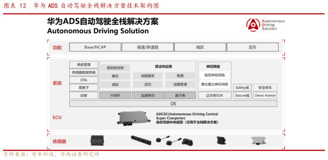 2、定位自动驾驶零部件供应商,ADS解决方案备受瞩目。华为ADS自动驾驶全栈解决方案,六年持续投入与产品迭代。一款L4级自动驾驶技术解决方案能否成功,高度依赖其设计者在硬件、算法和数据三方面的长期坚持和快速迭代。华为ADS解决方案持续六年的投入,在硬件、软件和算法方面持续发展迭代,拥有极强的自我更新和优化能力。