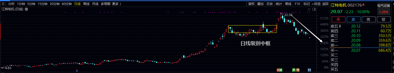 大家也多关心一下手里个股的三季报公布时间,但凡是故事讲得太满,业绩增速又达不到的话,那就小心挨板子。其实如果懂缠论的话,根本就不需要等到故事散场的时候,江特电机就是典型的日线级别背驰,从最高点32.56回落到中枢的时候,就应该获利止盈,根本不会吃到现在的板子,这种日线级别的背驰回落,时间长幅度大,大家要及时规避。