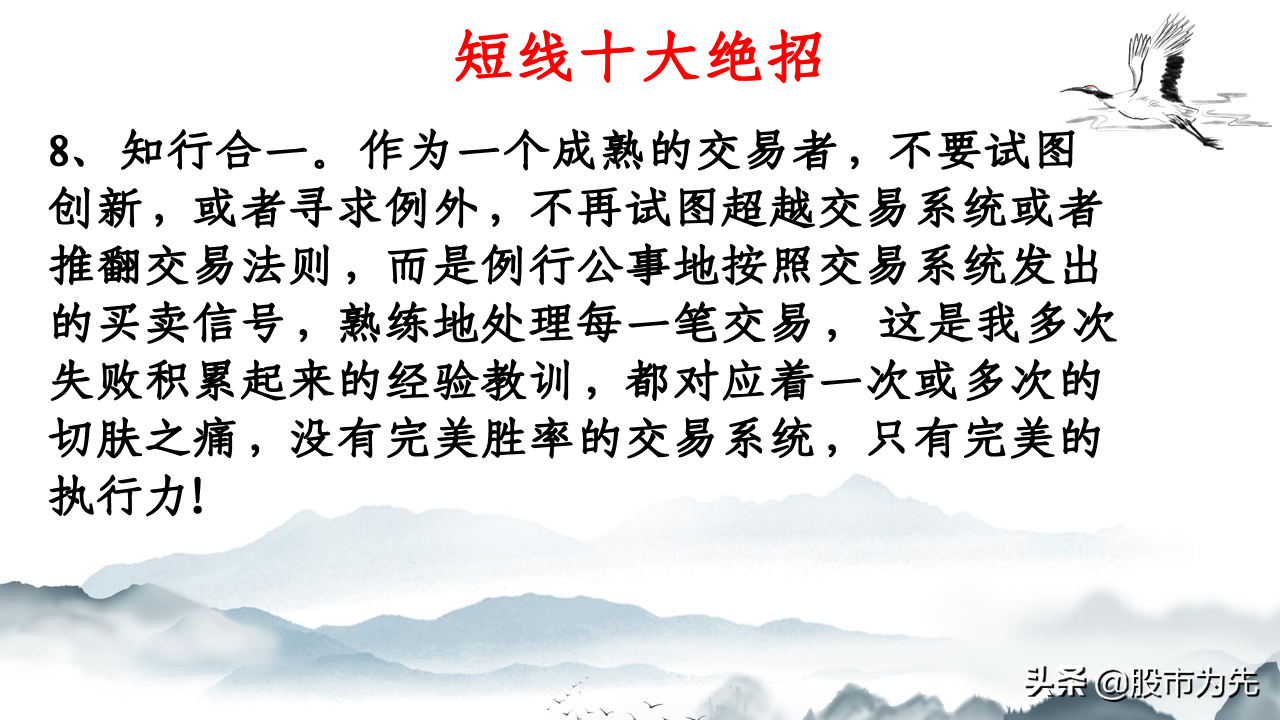 除了以上三点,我也将我炒股这些年经历的风风雨雨才总结出来的短线精髓分享给大家,真心希望大家可以认真研读,一条一条地理解,再加以运用,做到知行合一,相信能跑赢市场的大部分散户。