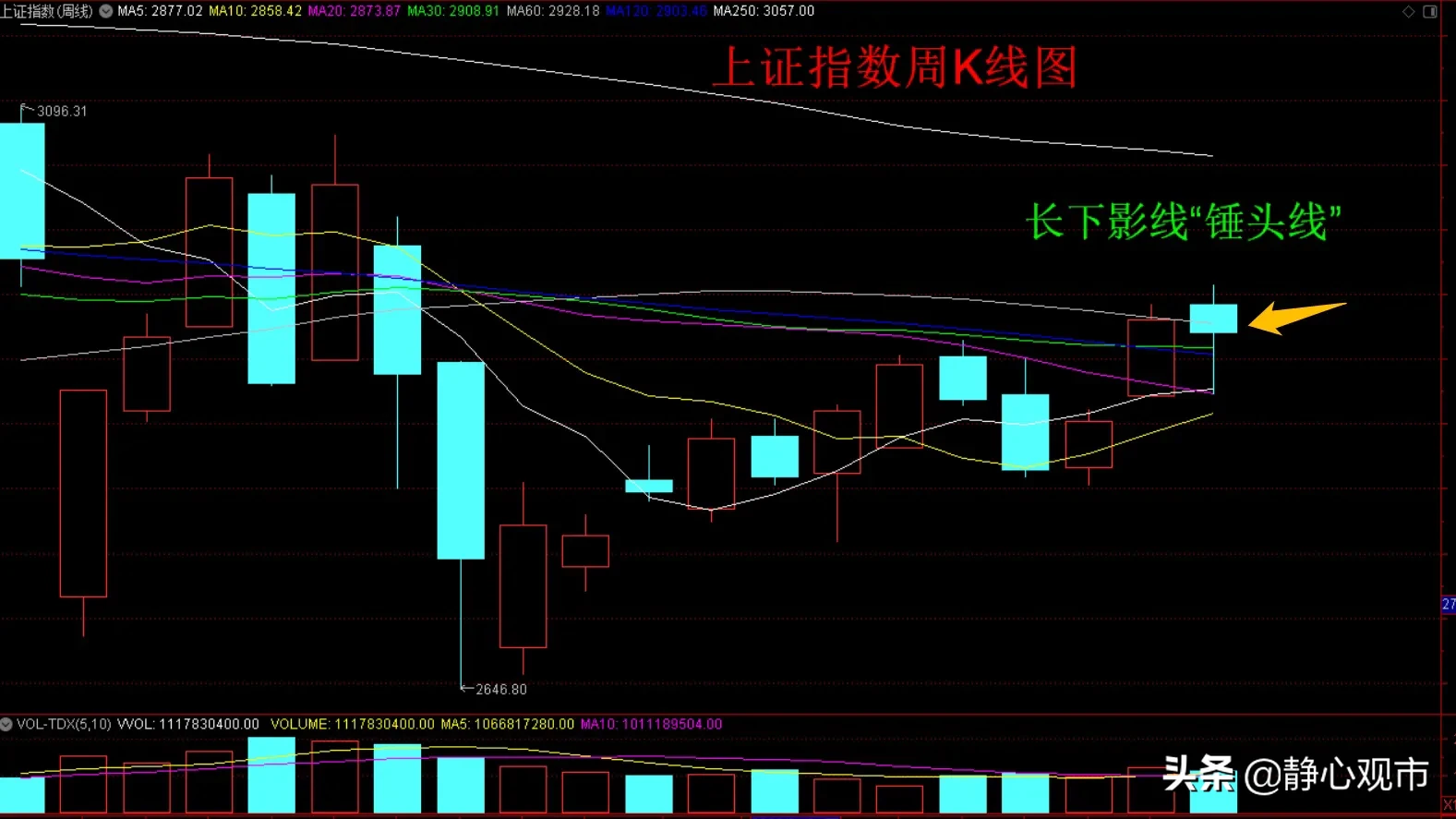 我们在昨天的股市周评中讲到上证指数周K线图出现了“锤头线”形态,深证成指周K线图出现了“十字星”形态,在前面的课程中我们也学习了什么是K线、如何根据K线形态来推测分时走势,以及K线的影线和实体都代表了什么,今天我们来讲一下单根K线的形态所体现出来的多空力量强弱对比。