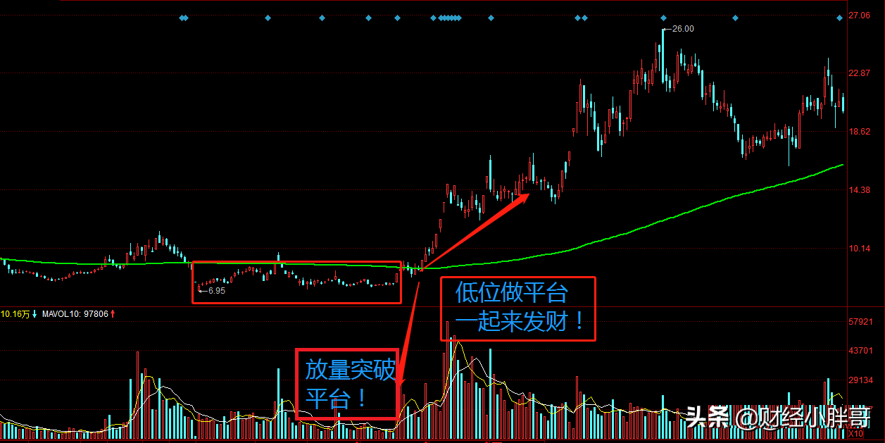 股价要是下跌后20日线开始走平,股价小范围波动,形成箱体平台,说明已经止跌,那么中长线就可以分批布局等待机会,一旦放量行情就开启。