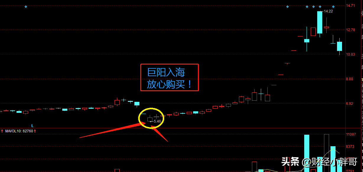 股价处于阴跌状态,但是某一天突然大幅度低开,直接砸盘,但是随后高走,收盘的时候形成了一根大阳线,这就叫巨阳入海,一旦遇到这样的形态,大概率转多,随时等待进场。