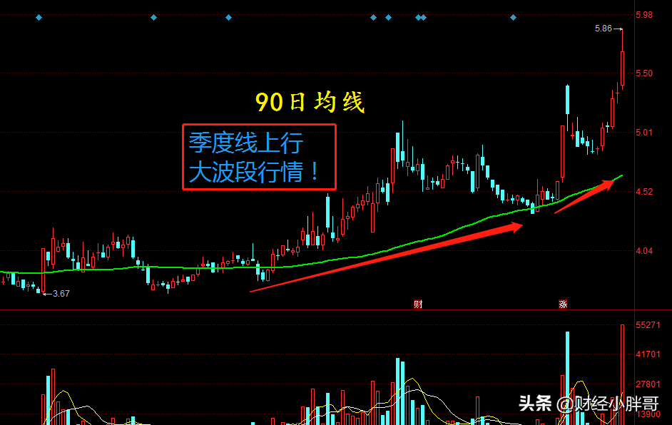 这里的季线也就是指90日均线,这根线表示的也是大趋势,要是季线向上,说明大趋势行情趋势就要开始,可以持续关注。