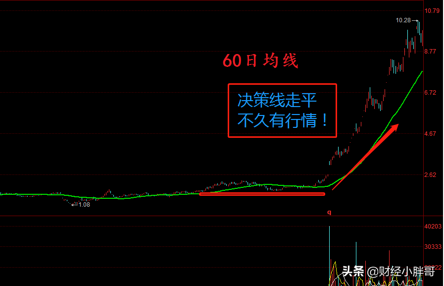 看长期趋势主要看60日均线,也叫决策线,当这根线走平,说明股价在底部横盘,一旦股价放量突破决策线,企稳后,大概率后续开始一波行情。