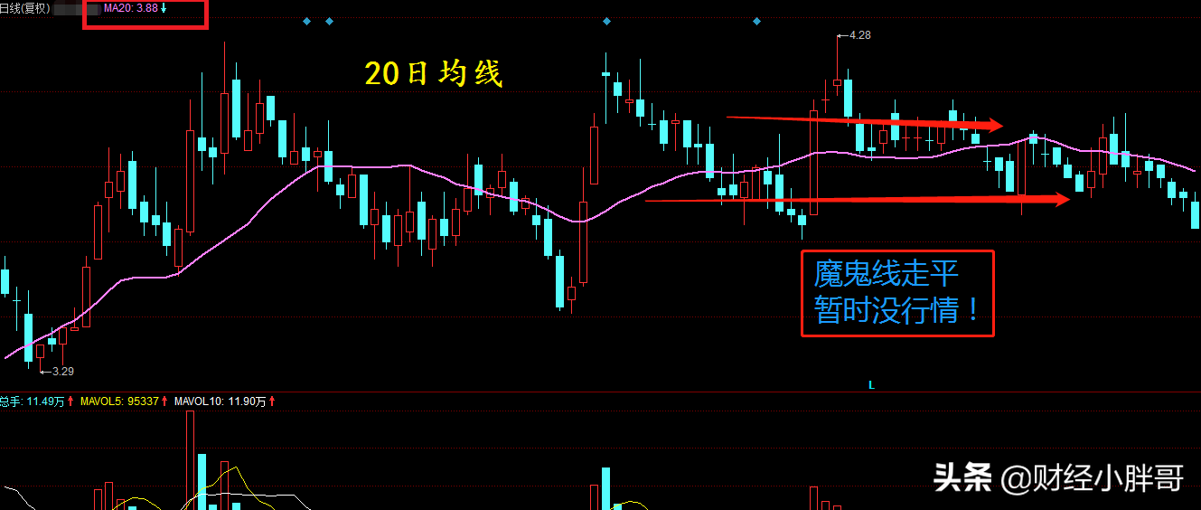 看短期趋势主要看20日均线,20日均线也叫多空博弈均衡线,俗称魔鬼线,要是这根线走平,那么说明多空博弈力量均衡,很多走出行情,休息就对了。在上涨趋势中,20日均线走平说明趋势结束,要是在下跌趋势中走平,说明止跌横盘为主。