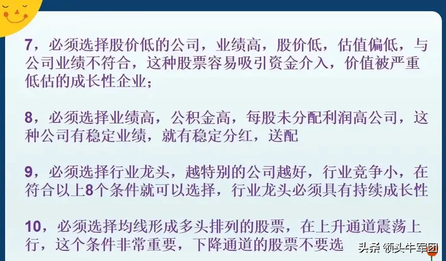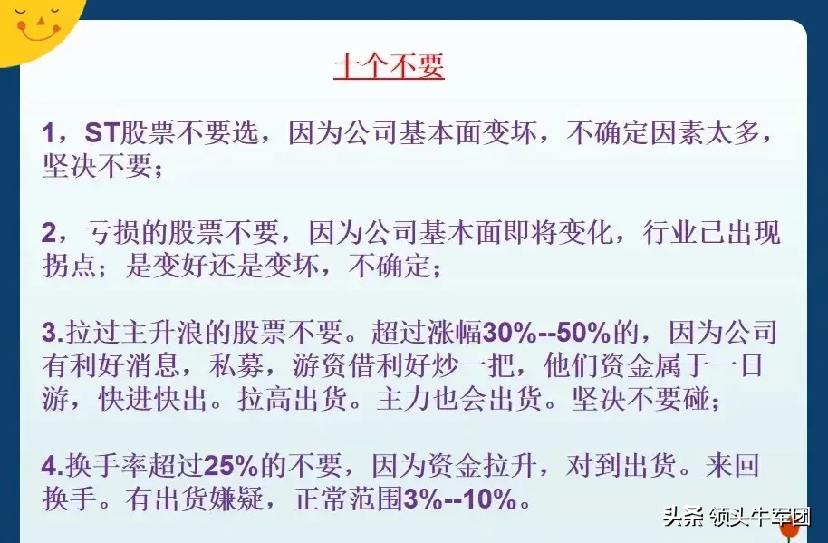 所以我今天特意整理出了选股十要与十不要,大家可以反复摸索一下,可以用这个技巧剔除市场中一部分不够优质的,然后再从王者中挑选出最强王者。