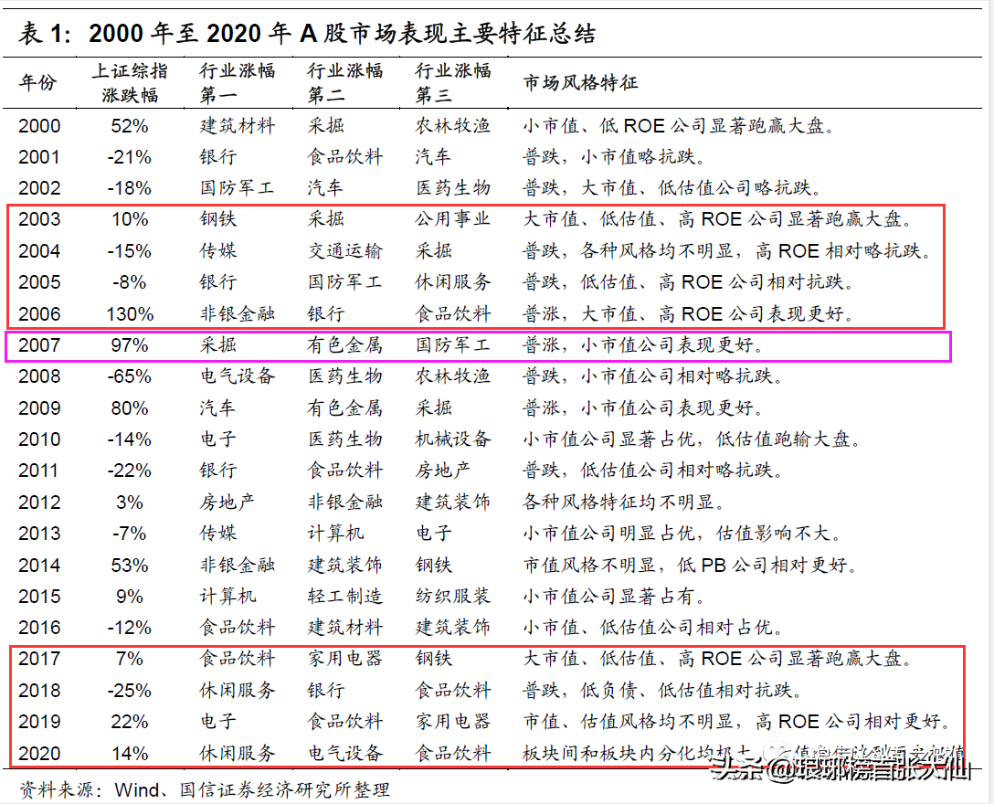 1、2017~2020年以大市值、低估值、高ROE的公司率先启动,跑赢大盘,类似于2003~2006年;
