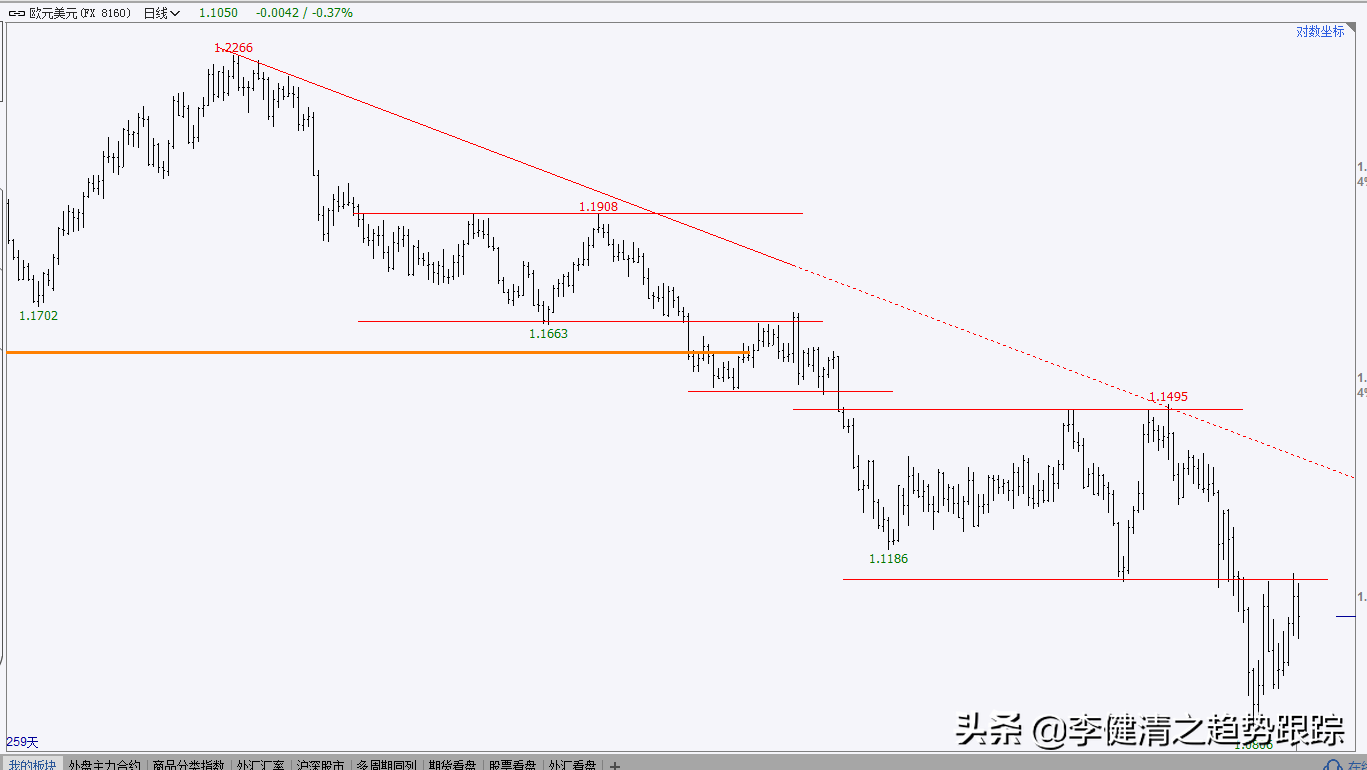 十一、外汇品种:美元走势影响,直接影响CRB指数、文华指数、原油指数、贵金属板块、外汇黄金、外汇美元相对应的外币对。比如:欧元/美元对。做相互对比印证参考。