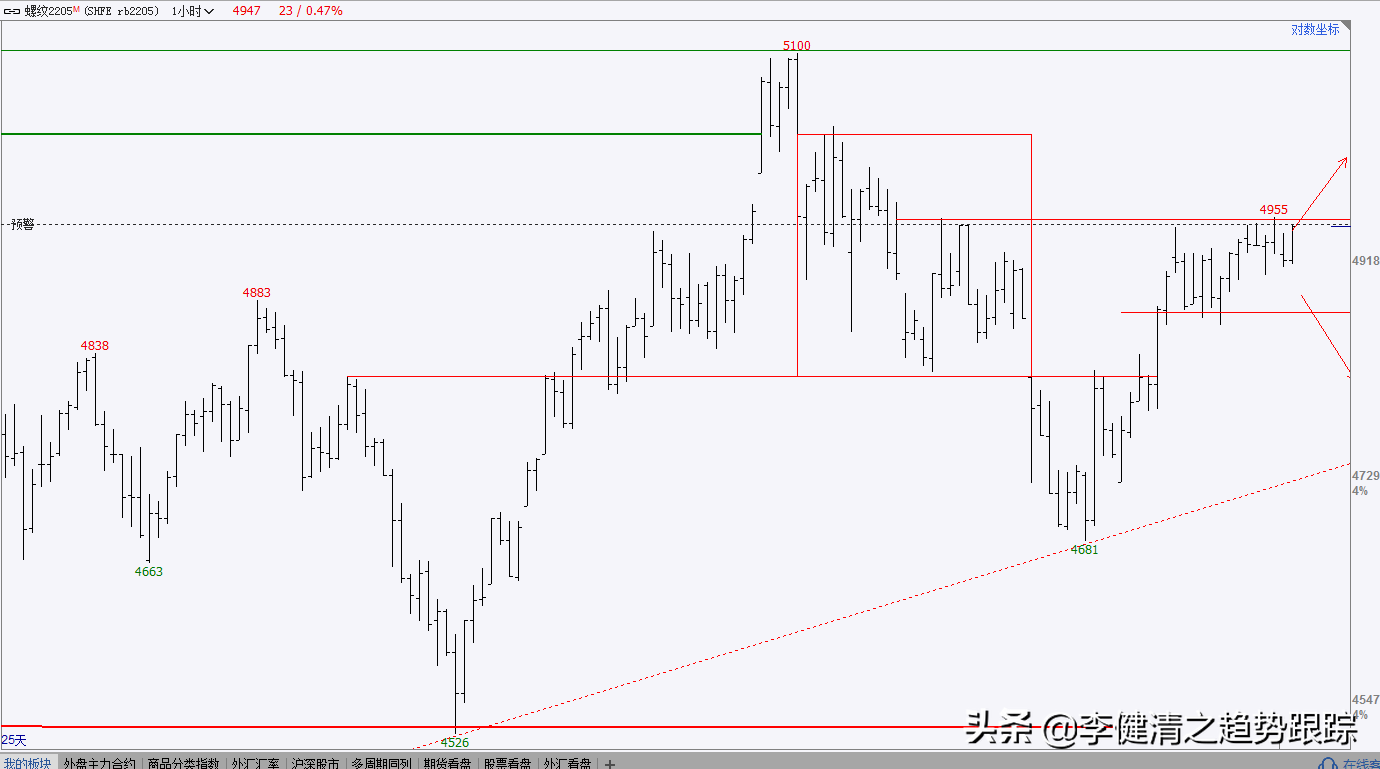六、短期看文华指数方向和原油价格走向,沿文华商品指数震荡后平台突破方向,在小时级别上确认,并参照原油价格对比分析。七、做多品种挑选:各板块在小时级别形态判定短期方向。做多板块中做多品种:螺纹:铁矿1小时级别已突破颈线位,螺纹做小平台,若突破箱体平台上沿4955,短期波段或日内多。短期及日内均开多。若向下突破平台4875,则短期波段或日内开空,以小时级别的形态突破为准。
