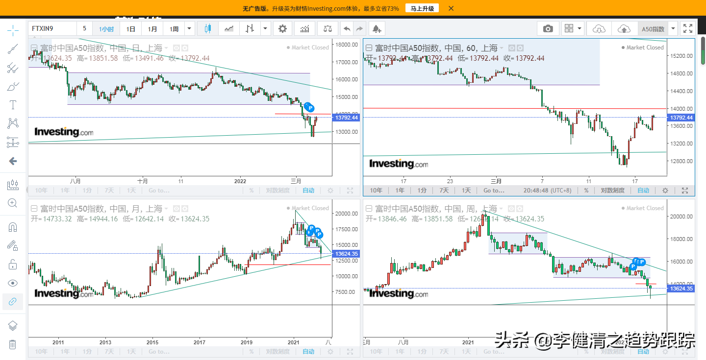 十二、 富时中国A50指数:周线趋势空,周线级别下破复合头肩顶颈线位,日线趋势空、不操作等待。