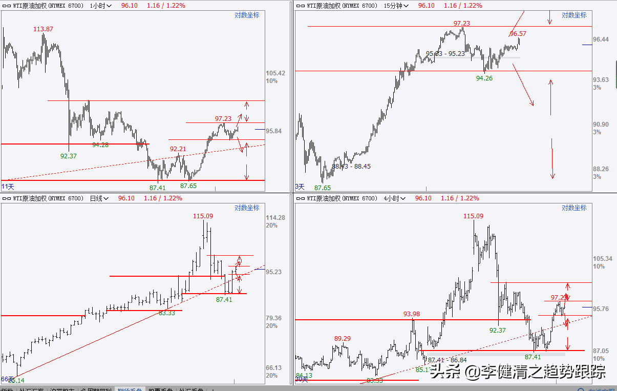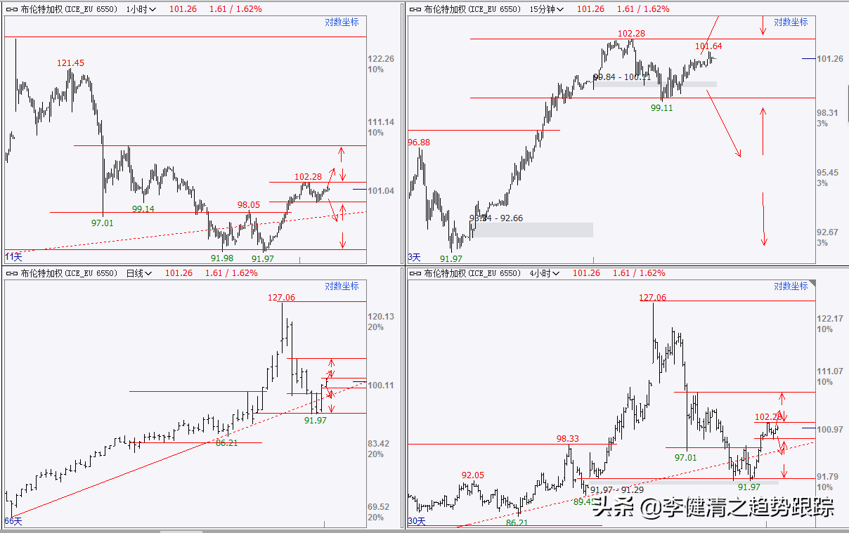 三、国际原油:美原油及布伦特原油周级多、日级多、4小时多、1小时级别趋势多,布伦特原油为例:1小时级别做箱体平台99.11-102.28。价格在1小时级别箱体内若突破上边沿,则按照箱体突破确认,国内商品继续做多。若回调下破箱体下边界,即是下破1小时级别颈线位位,则国际原油短期波段空。在91.97边界附近有支撑带,在1小时级别内打到支撑带不破,则中短期继续多。影响国内原油指数以及受原油影响的其他相关品种(化工、农产品等)。