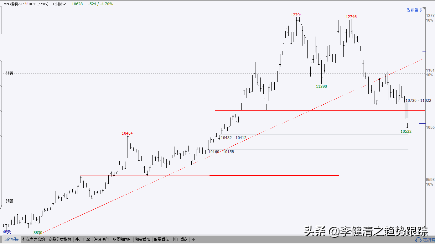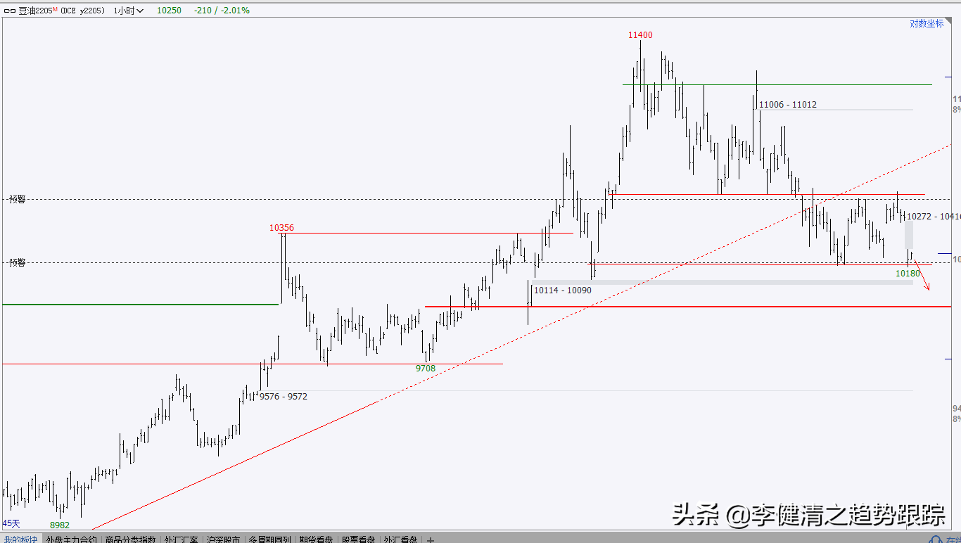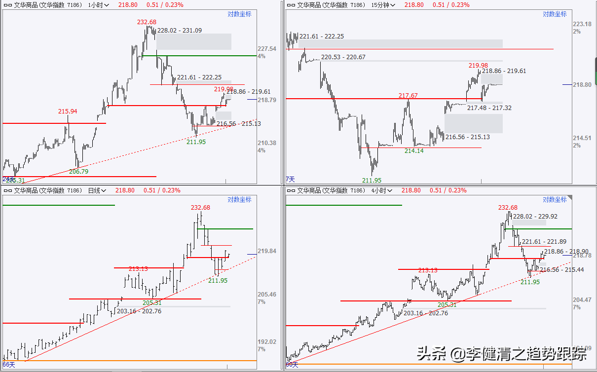 四、文华指数:周多、日多、4时多、1小时多。日线级别未破上升趋势线。中期波段及日波段多。参考美元、CRB指数、外盘原油等走势方向。