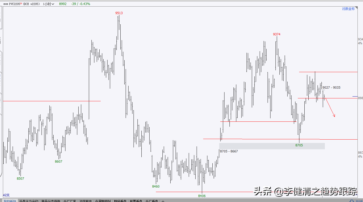 八、做空品种挑选:做空板块中挑选出做空品种:PVC、PTA、豆油。PVC、PTA等待15分钟级别平台上下破位为准。豆油对标棕榈油,棕榈油已经跌破颈线位。