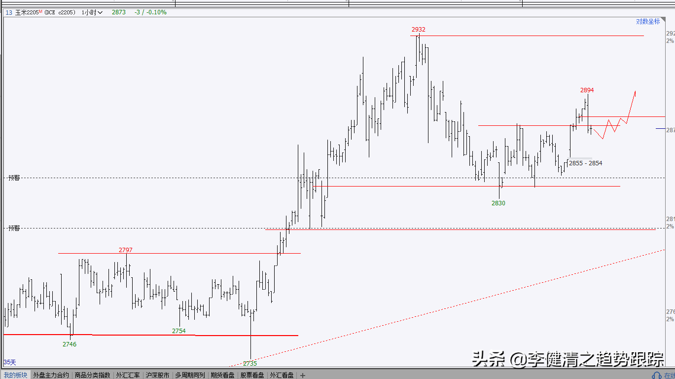 玉米:1小时级别突破平台,趋势多,在15分钟箱体平台形态突破为进场点,上突多开多单,下破日内开空单。