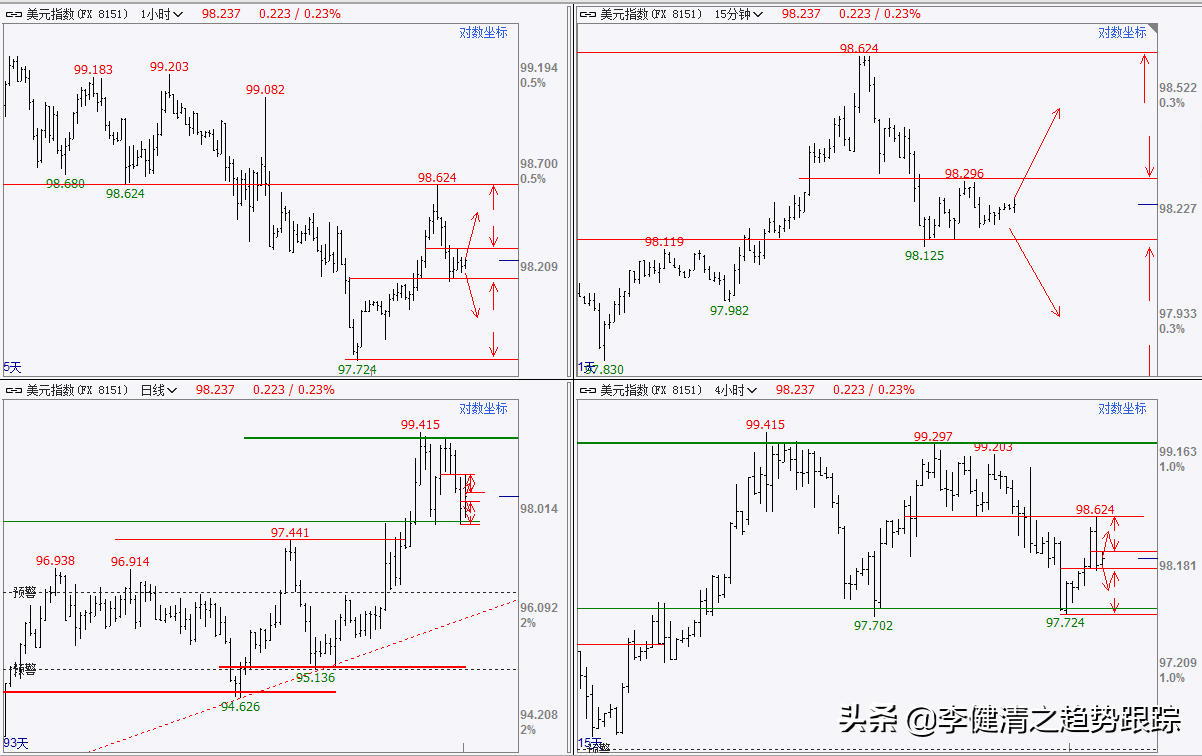 一、美元指数:周多,日多、小时级别趋势空,价格上方98.624附近压力带,突破压力带,中短期多。15分钟级别箱体98.125-98.296。突破15分钟箱体上沿,顶到压力带回调,短期空。下破15分钟箱体下沿,继续空。短期波段以1小时级别趋势为主,以1小时级别箱体97.724-98.624为界,下破97.724,中期波段空。美元指数只做为参考。(直接影响CRB指数、国际原油指数、文华指数、贵金属板块、外汇美元相对应的外币对。)