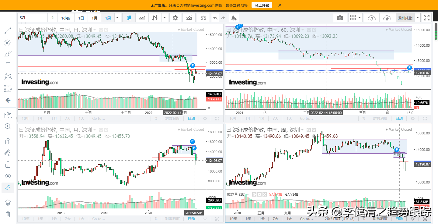 上证指数、深证指数:周空、日空。深成指已破周级颈线位。股票尽量空仓,不操作,空仓等待。