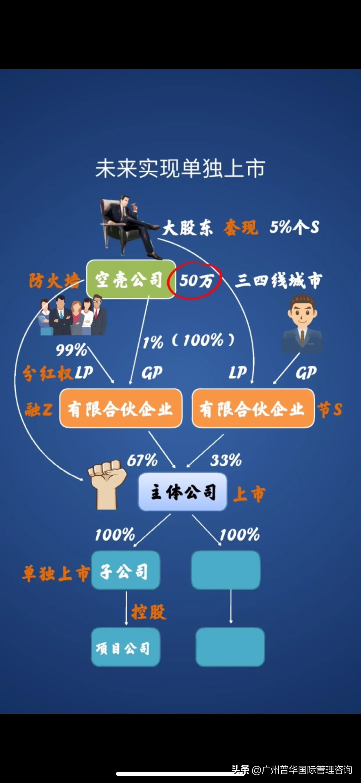 2注册两家有限合伙企业分别在主体公司持股67%和33%,一个用来融资,用空壳公司当普通合伙人(GP),可以规避GP的无限连带责任,占股1%也有100%话语权,投资人当有限合伙人(LP)占股99%只有分红权。另一个用来分红套现,注册在税收洼地,让其他股东当GP你当LP(规避个人当GP的无限连带责任),然后申请核定征收,未来股份套现个税只有5%
