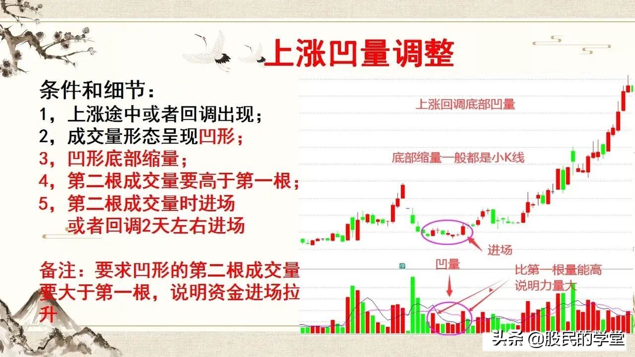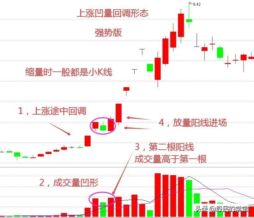 1,上涨途中或者回调底部出现,成交量凹形;