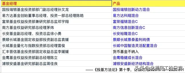#投基方法论# 第七季到第十季的40期基金经理也整理出来了,剔除货币基金、指数基金、量化基金、fof等,并剔除了一些风格漂移、管理时间不长、长期业绩不够有吸引力的基金经理(包括一些重复访谈的不再纳入),下月准备新增这几只产品观察: