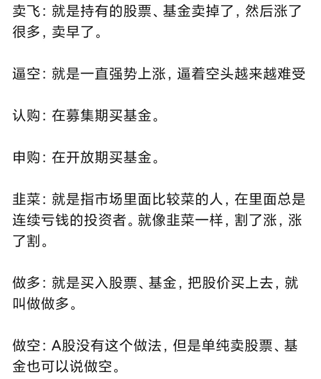 韭菜:就是指市场里面比较菜的人,在里面总是连续亏钱的投资者。就像韭菜一样,割了涨,涨了割。