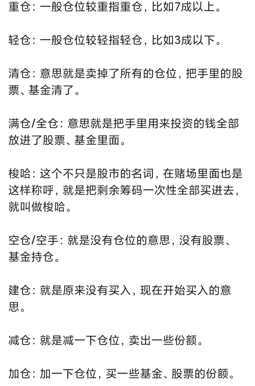 满仓/全仓:意思就是把手里用来投资的钱全部放进了股票、基金里面。