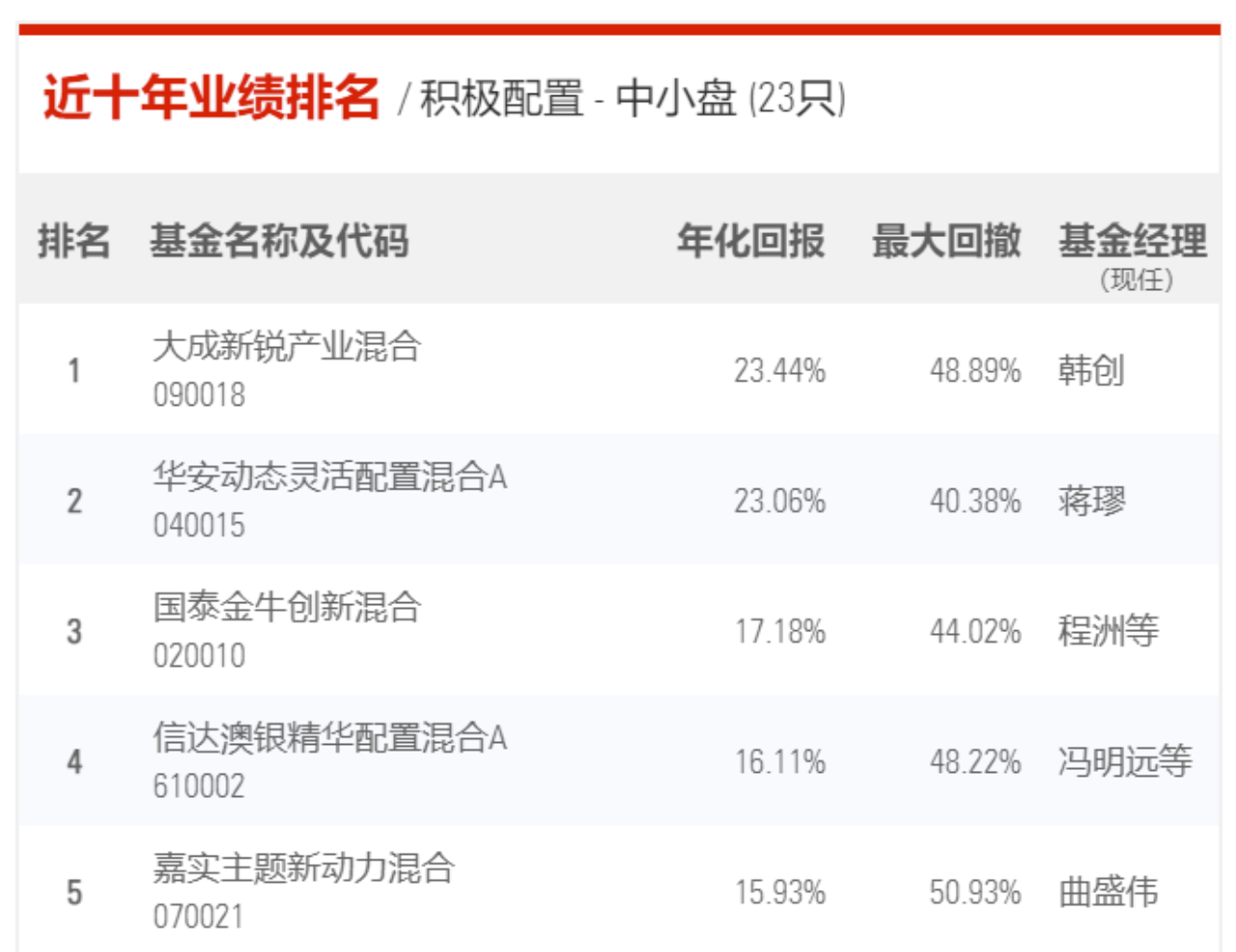 第一名,大成新锐产业混合,年化回报23.44%,最大回撤48.89%;